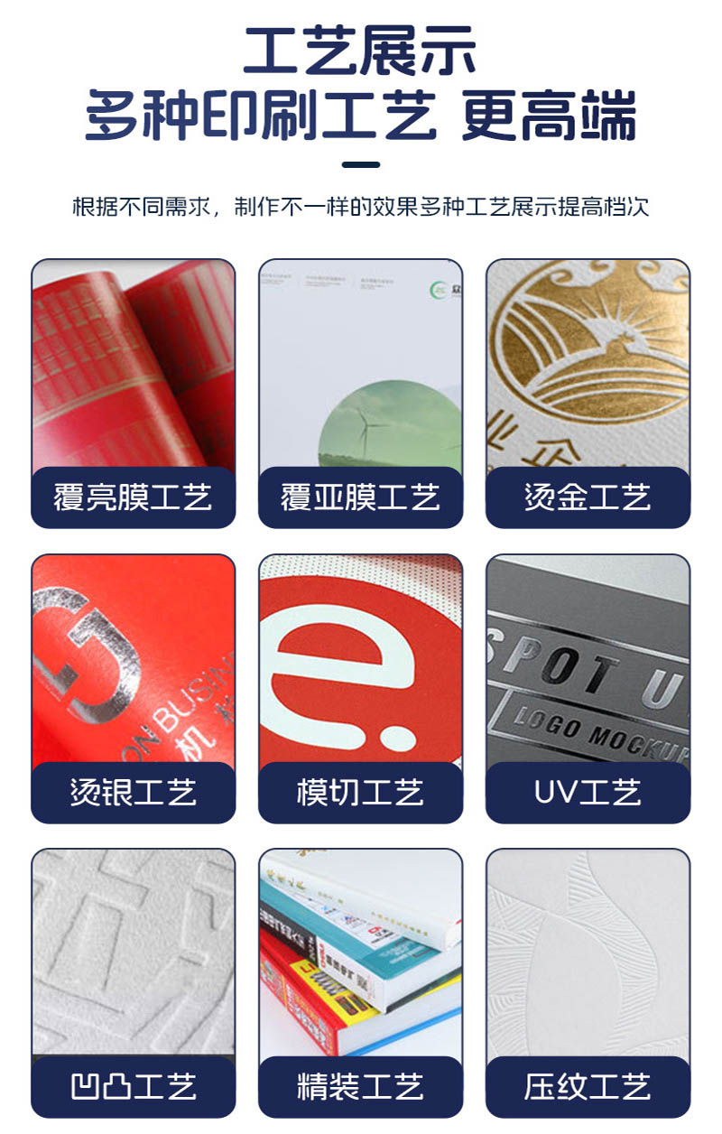 印刷紙張:銅版紙、雙膠紙、啞粉紙、珠光紙、其他藝術(shù)紙(藝術(shù)紙種類較多我們可以免費提供紙樣供您選擇)