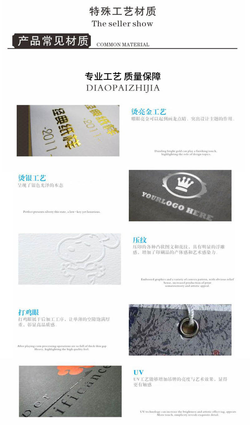 常用工藝:覆膜(啞膜、光膜)、壓紋、凹凸印、局部uv、燙銀、燙金、印專色(PANTONE色)、鏤空、鐳射、打孔、疊印、絲網(wǎng)印、透印、過光油、啞油等