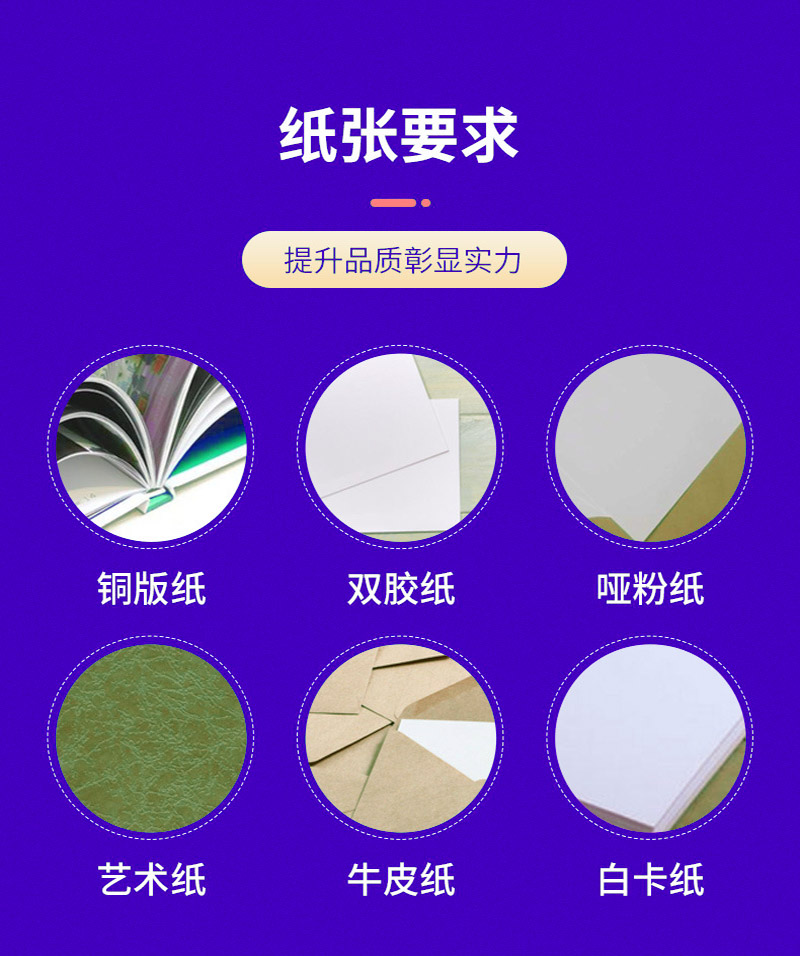 印刷紙張:銅版紙、雙膠紙、啞粉紙、珠光紙、其他藝術(shù)紙(藝術(shù)紙種類較多我們可以免費(fèi)提供紙樣供您選擇)