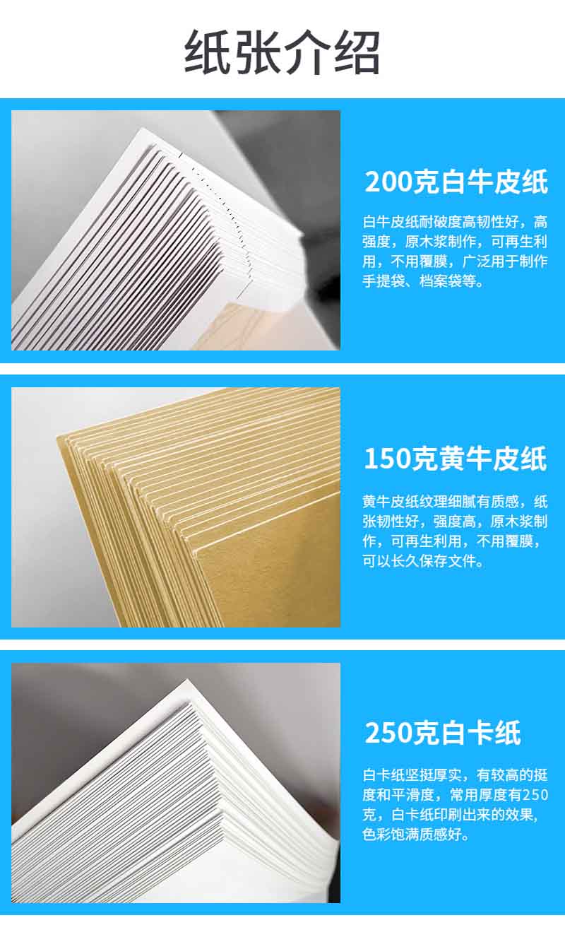 印刷紙張:銅版紙、雙膠紙、啞粉紙、珠光紙、其他藝術(shù)紙(藝術(shù)紙種類較多我們可以免費提供紙樣供您選擇)