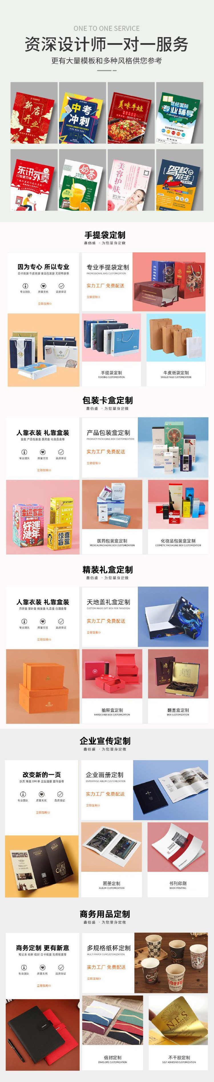 印刷紙張:銅版紙、雙膠紙、啞粉紙、珠光紙、其他藝術(shù)紙(藝術(shù)紙種類較多我們可以免費提供紙樣供您選擇)
