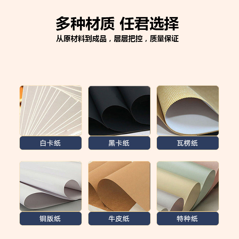 印刷紙張:銅版紙、雙膠紙、啞粉紙、珠光紙、其他藝術紙(藝術紙種類較多我們可以免費提供紙樣供您選擇)
